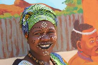 This is a beautiful woman from Matobo. She has done to her face what is called ukucomba or ukubhuda. This is very similar to the face powders used today but very different. This woman used soil. She had different types of colours for the art. She also used ash which is the base coat, just like nowadays there are foundations. She then applies the brown soil ontop which goes with her skin colour. So do women these days, they use powders according to their skin colour. Then she damps the other colours which she is going to use for the art. It is damped so that it lasts and comes out nicely on the face. For the lip colour she uses a coal.